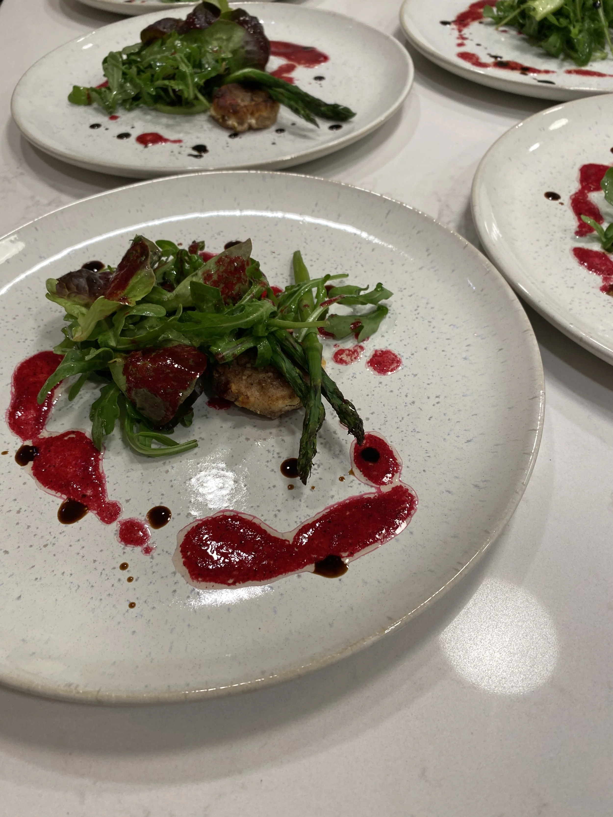 Salad, Pecan-Crusted Goats Cheese, Grilled Asparagus, Greens, Beet Vinaigrette, Aged Balsamic